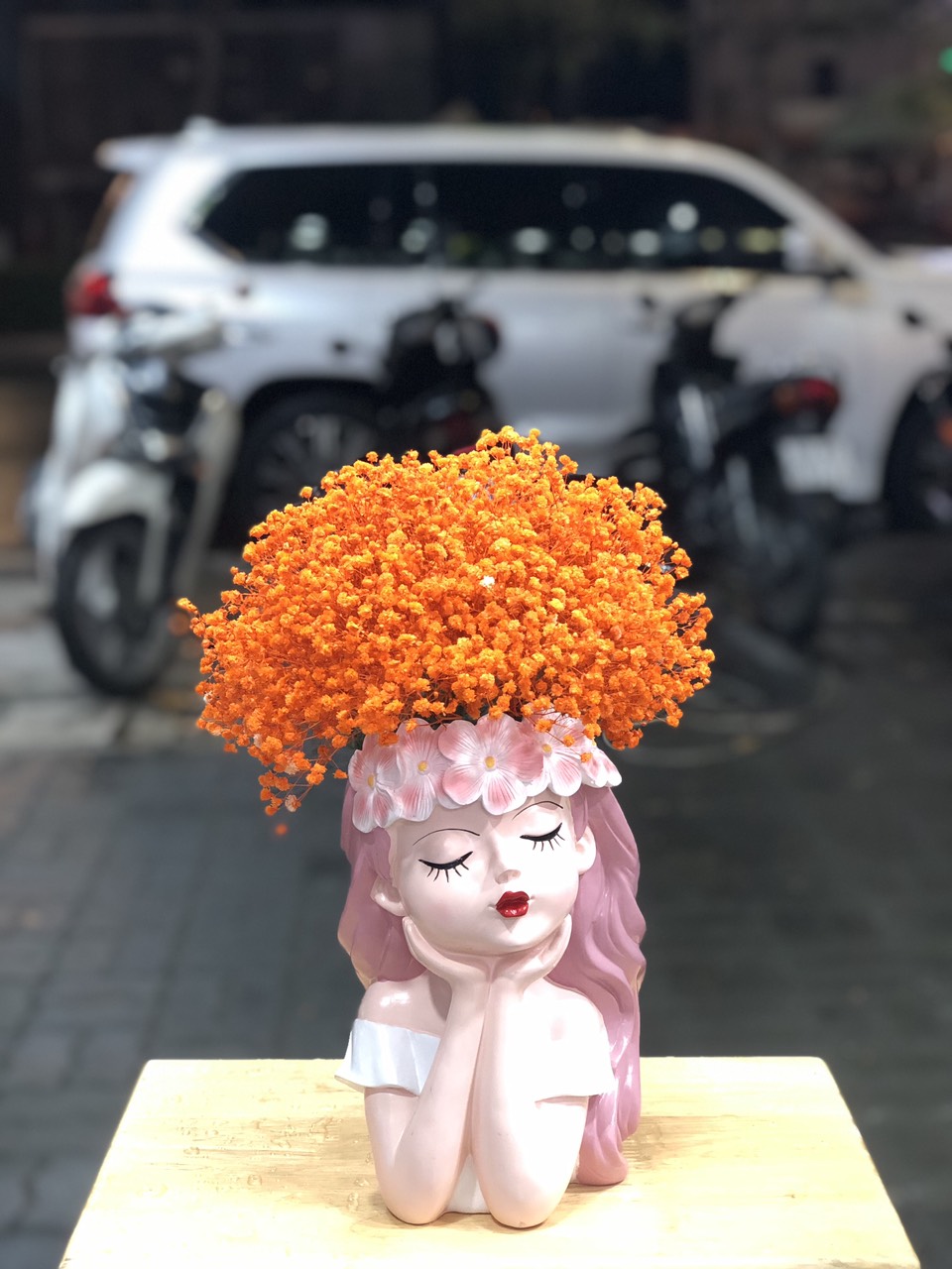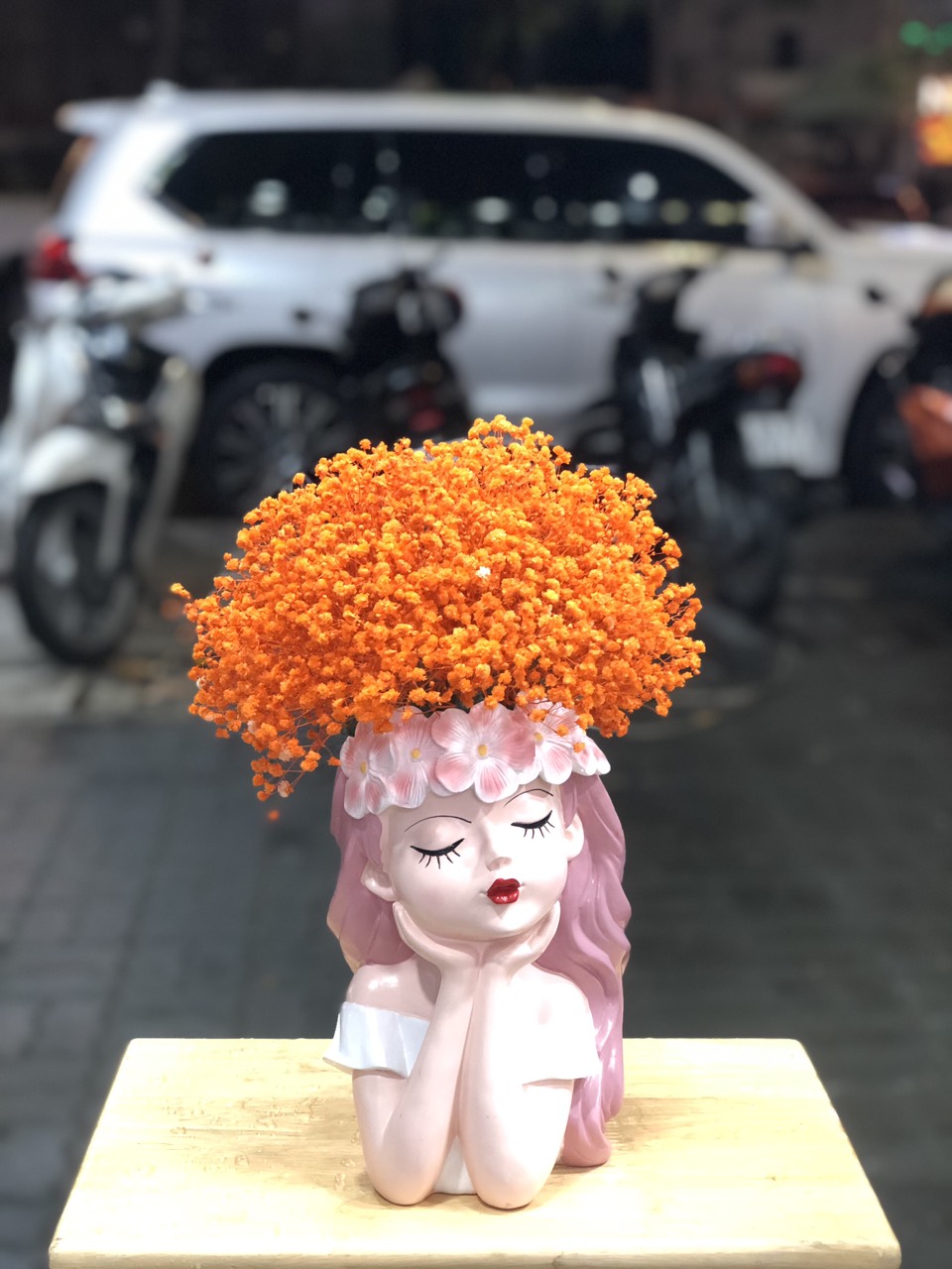 Hoa Baby khô màu cam được cắm vào bình búp bê đáng yêu tạo nên một nàng công chúa búp bê với mái tóc màu cam bồng bềnh, xinh xắn.