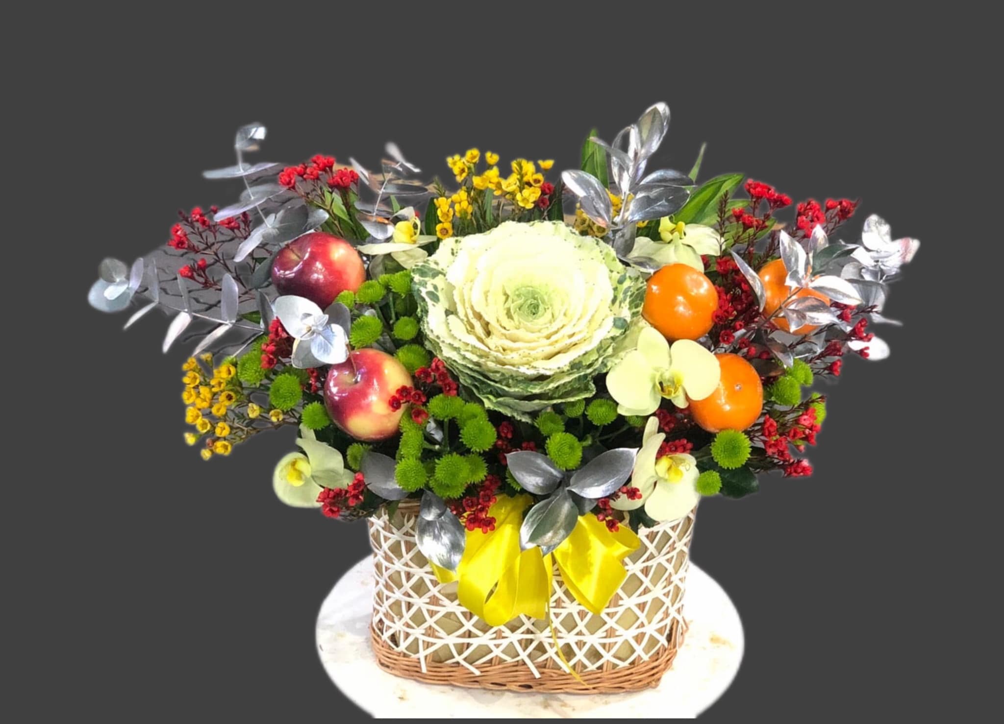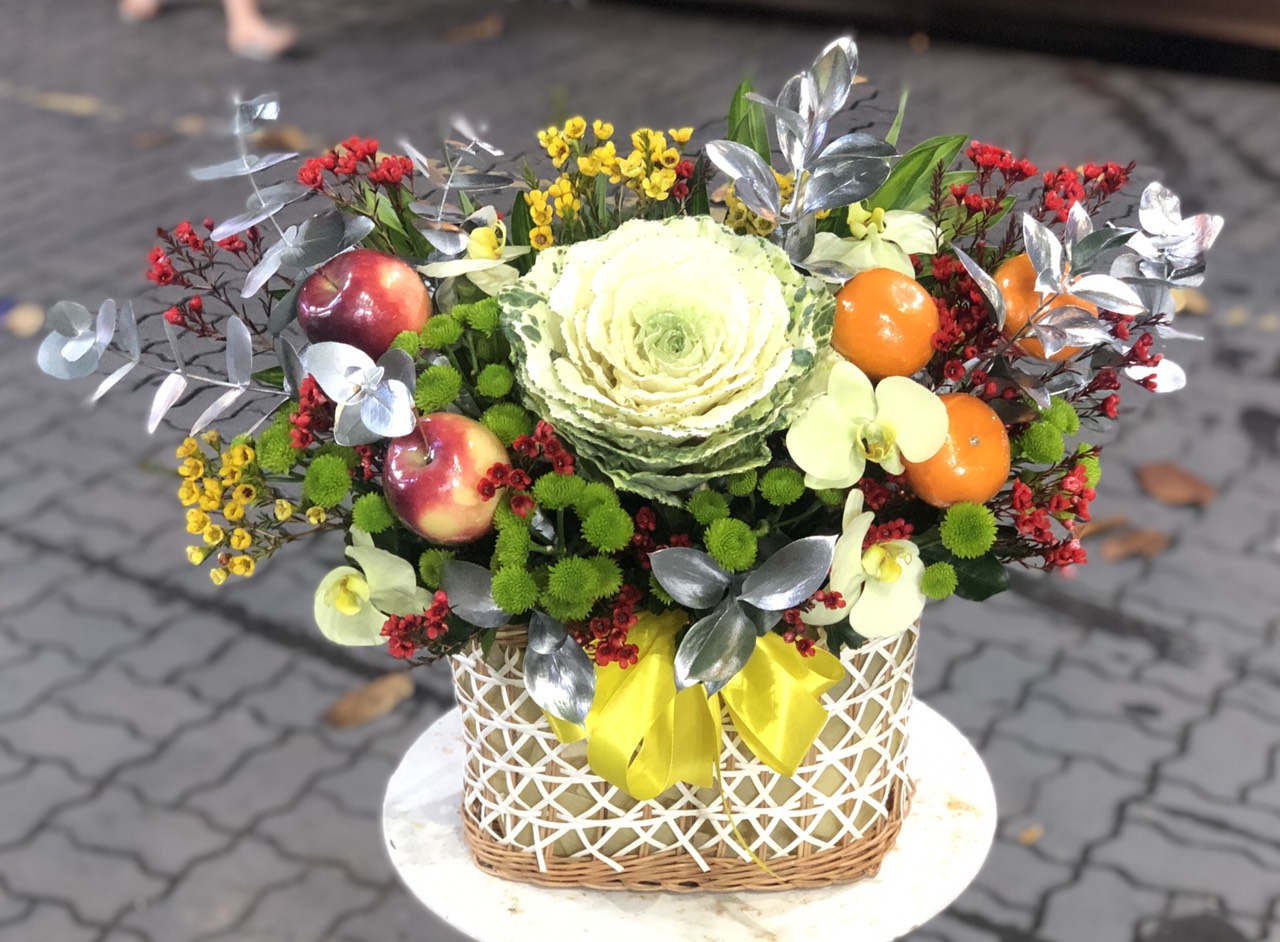 GIỎ HOA TRÁI CÂY THEO PHONG CÁCH HIỆN ĐẠI - HTC007 được cắm kết hợp trái cây và hoa tươi, mang lại vẻ tinh tế, sang trọng, quý phái.