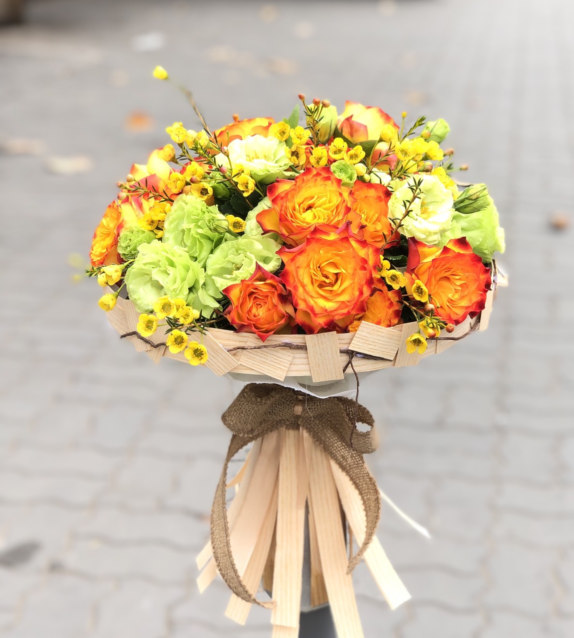 Hoa hồng cam được lựa chọn tỉ mỉ, bó kết hợp với hoa cát tường, hoa thanh liễu và hoa lá phụ tạo nên BÓ HOA HỒNG CAM THEO PHONG CÁCH PHƯƠNG TÂY - HB007 thật đơn giản mà lộng lẫy, sang trọng.