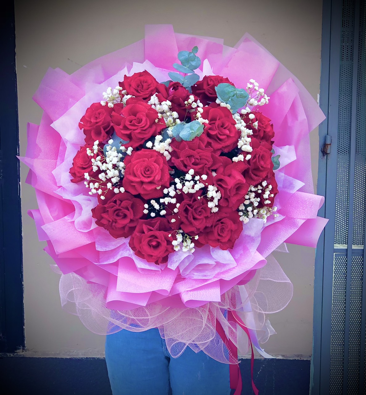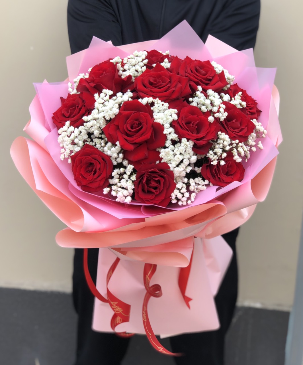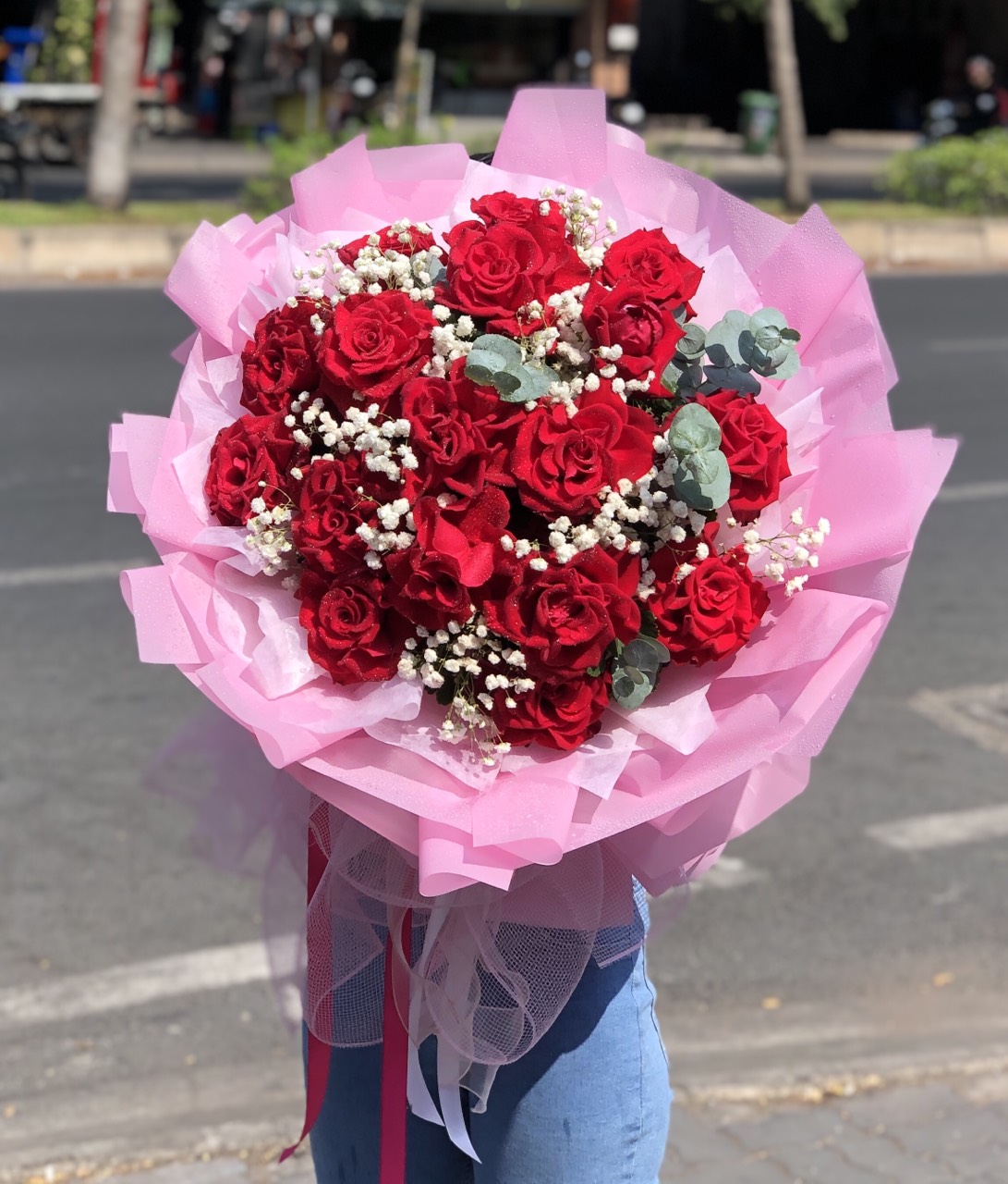 BÓ HOA HỒNG ĐỎ - HB003 được bó kết hợp với giấy gói màu hồng mang lại cảm giác ngọt ngào, đáng yêu.