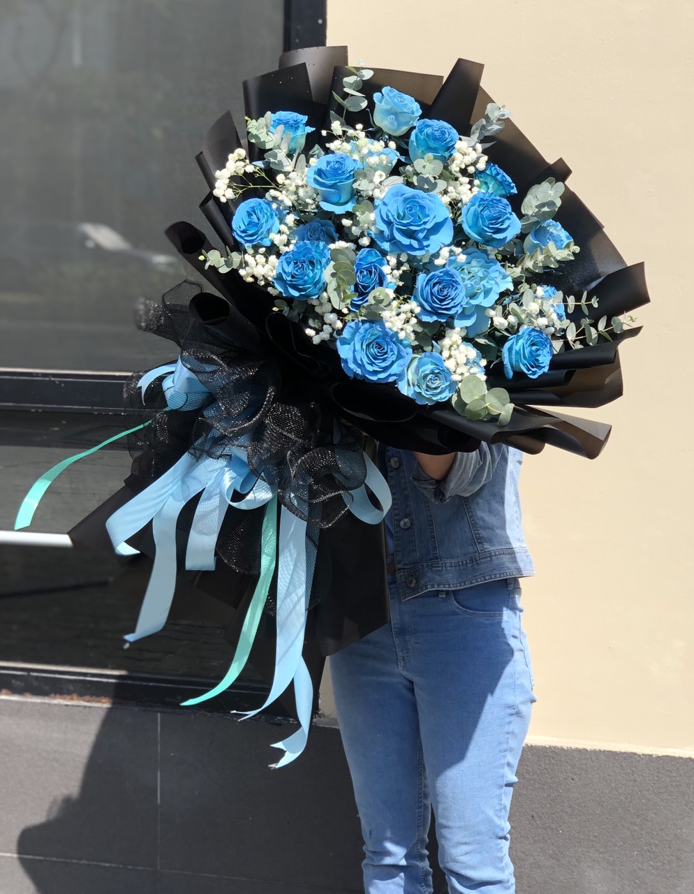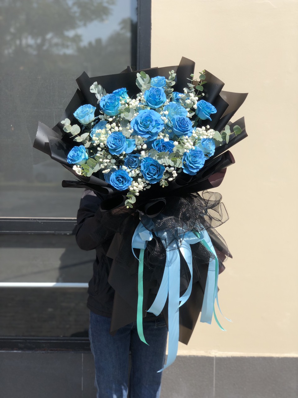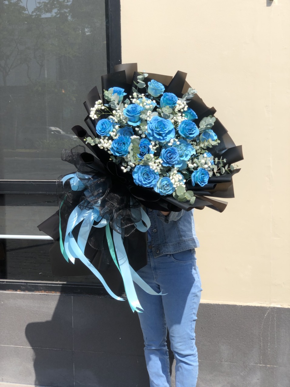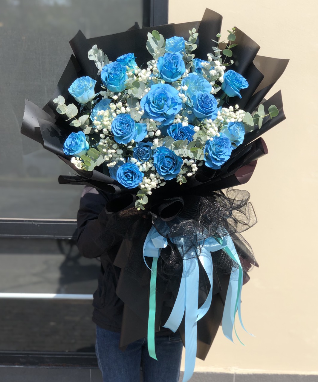 BÓ HOA HỒNG XANH DƯƠNG - HB004 được bó kết hợp với giấy gói màu đen mang lại cảm giác sang trọng, kiêu sa.