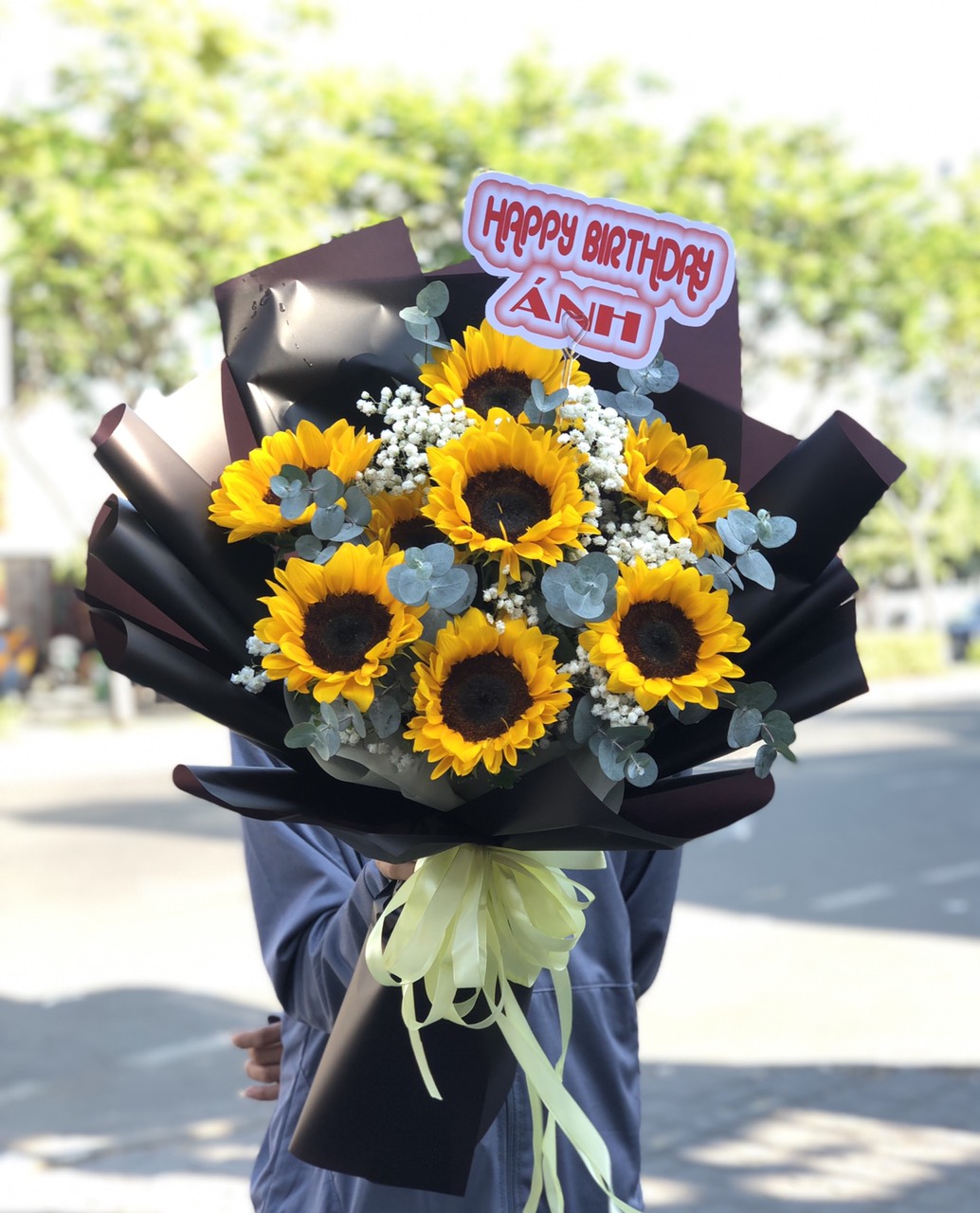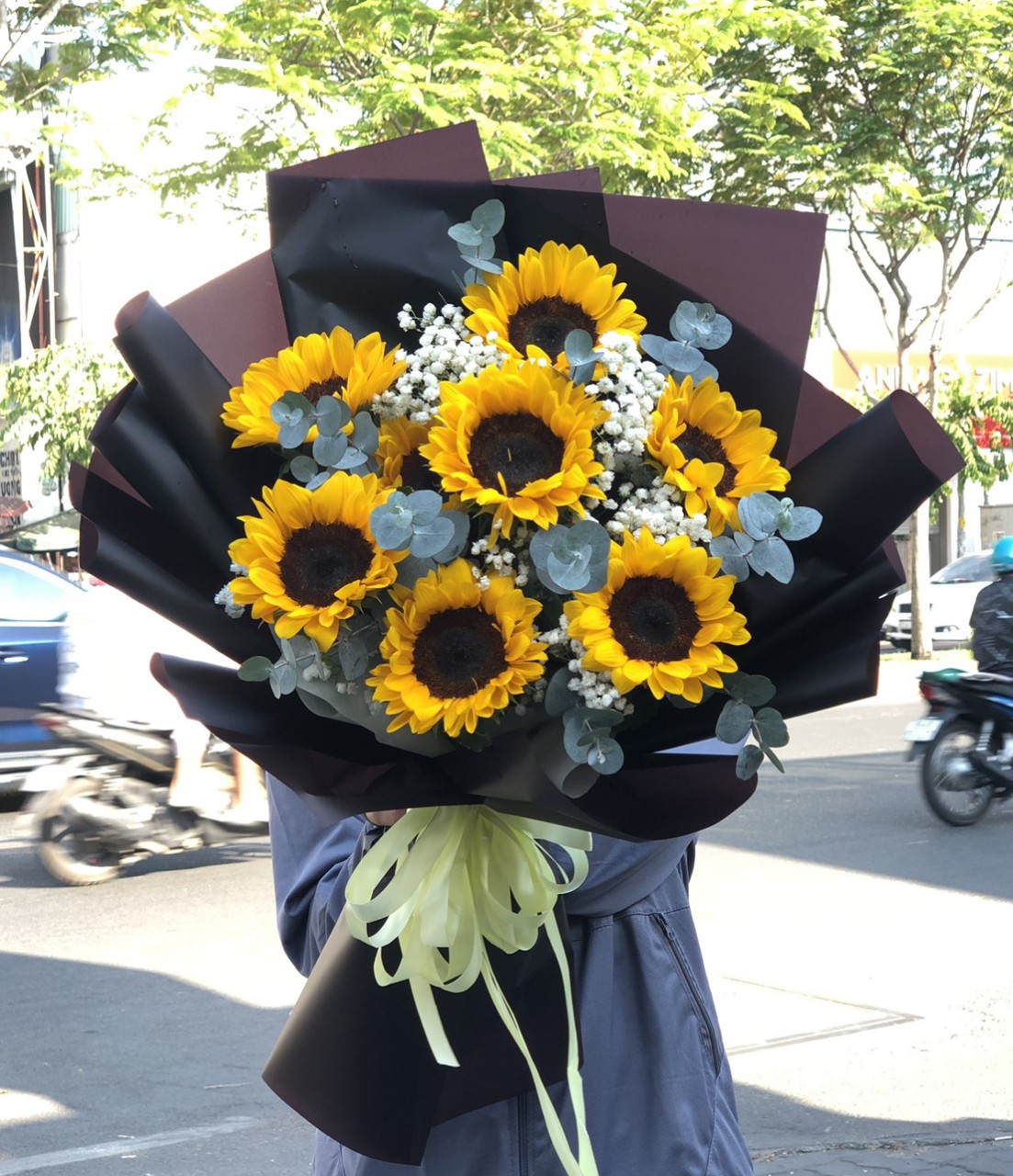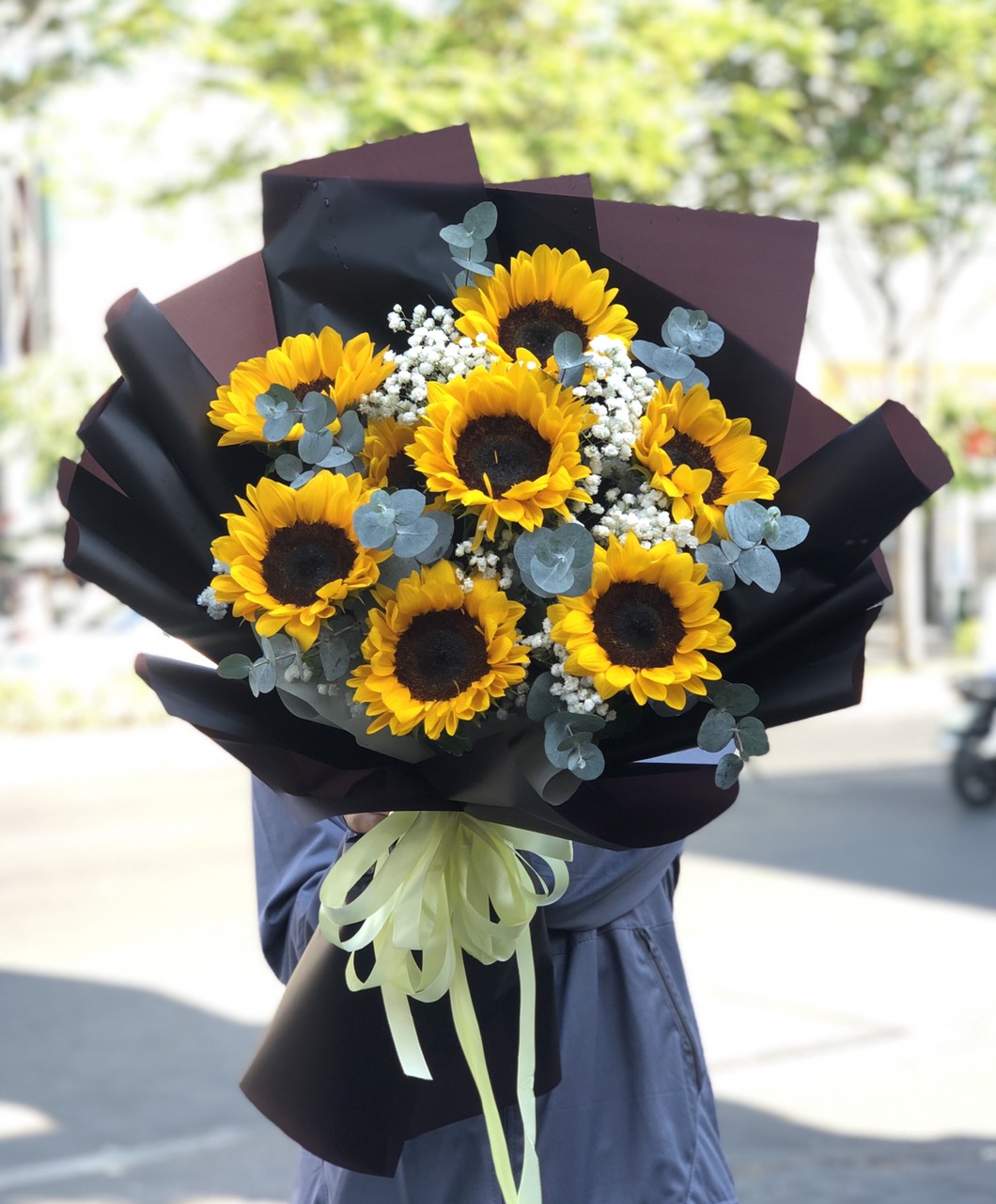 BÓ HOA HƯỚNG DƯƠNG - HB014 được bó kết hợp với giấy gói màu đen mang lại vẻ lịch sự, sang trọng.