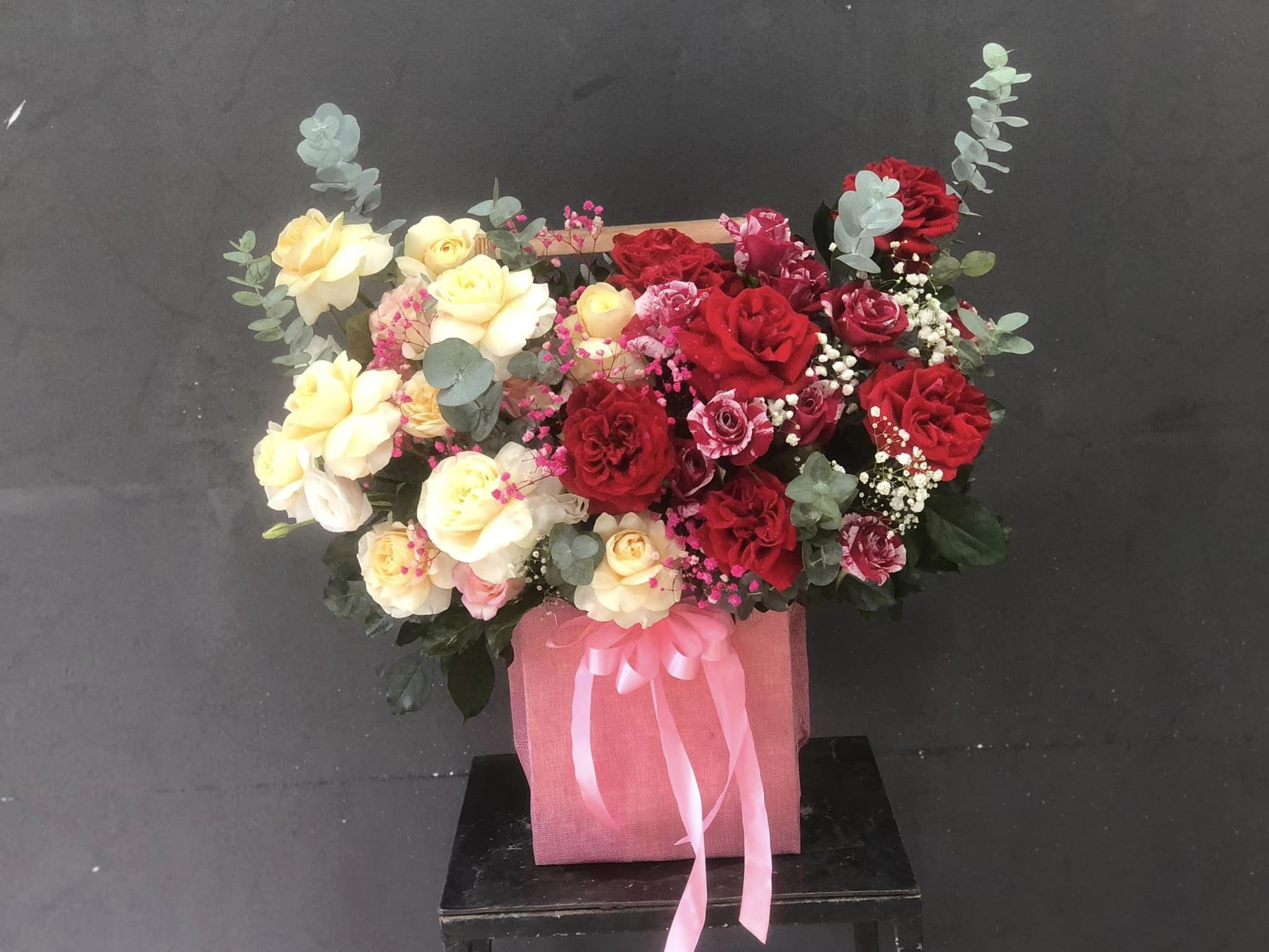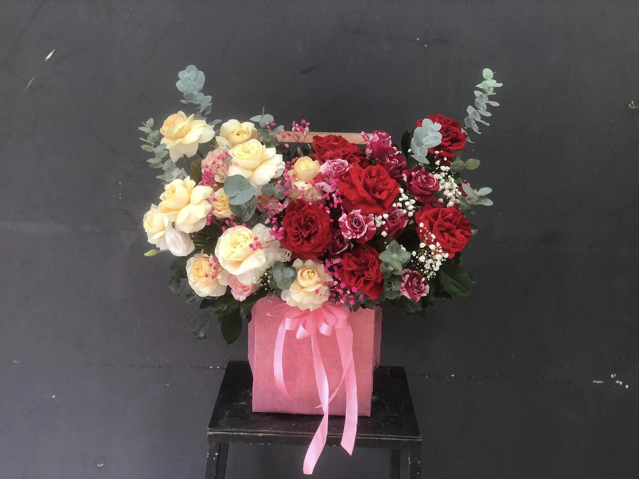 GIỎ HOA HỒNG MIX THEO PHONG CÁCH HIỆN ĐẠI - HG002 được cắm vào giỏ theo phong cách hiện đại mang lại cảm giác tinh tế, sang trọng.