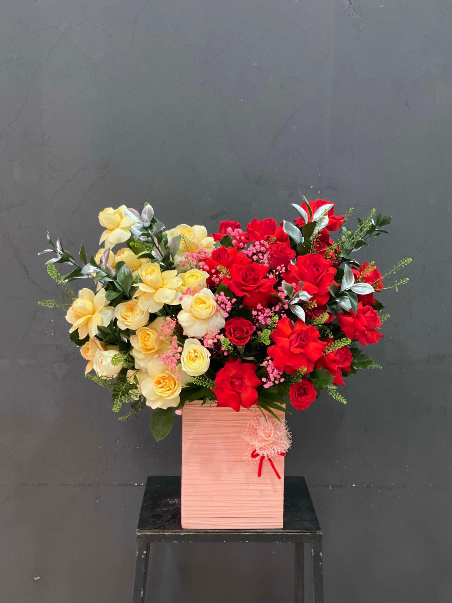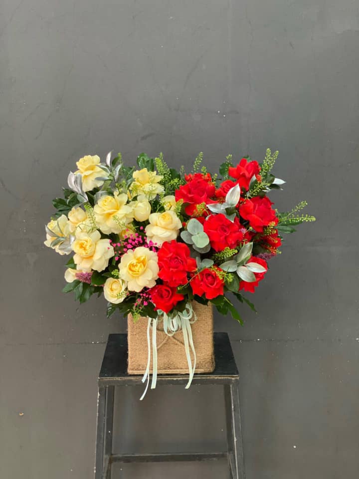 Hoa hồng đỏ, hoa hồng victor vàng mix với nhau và thêm hoa lá phụ, cắm theo phong cách hiện đại tạo nên GIỎ HOA HỒNG MIX THEO PHONG CÁCH HIỆN ĐẠI - HG002 thật rực rỡ nhưng cũng không kém phần sang chảnh.