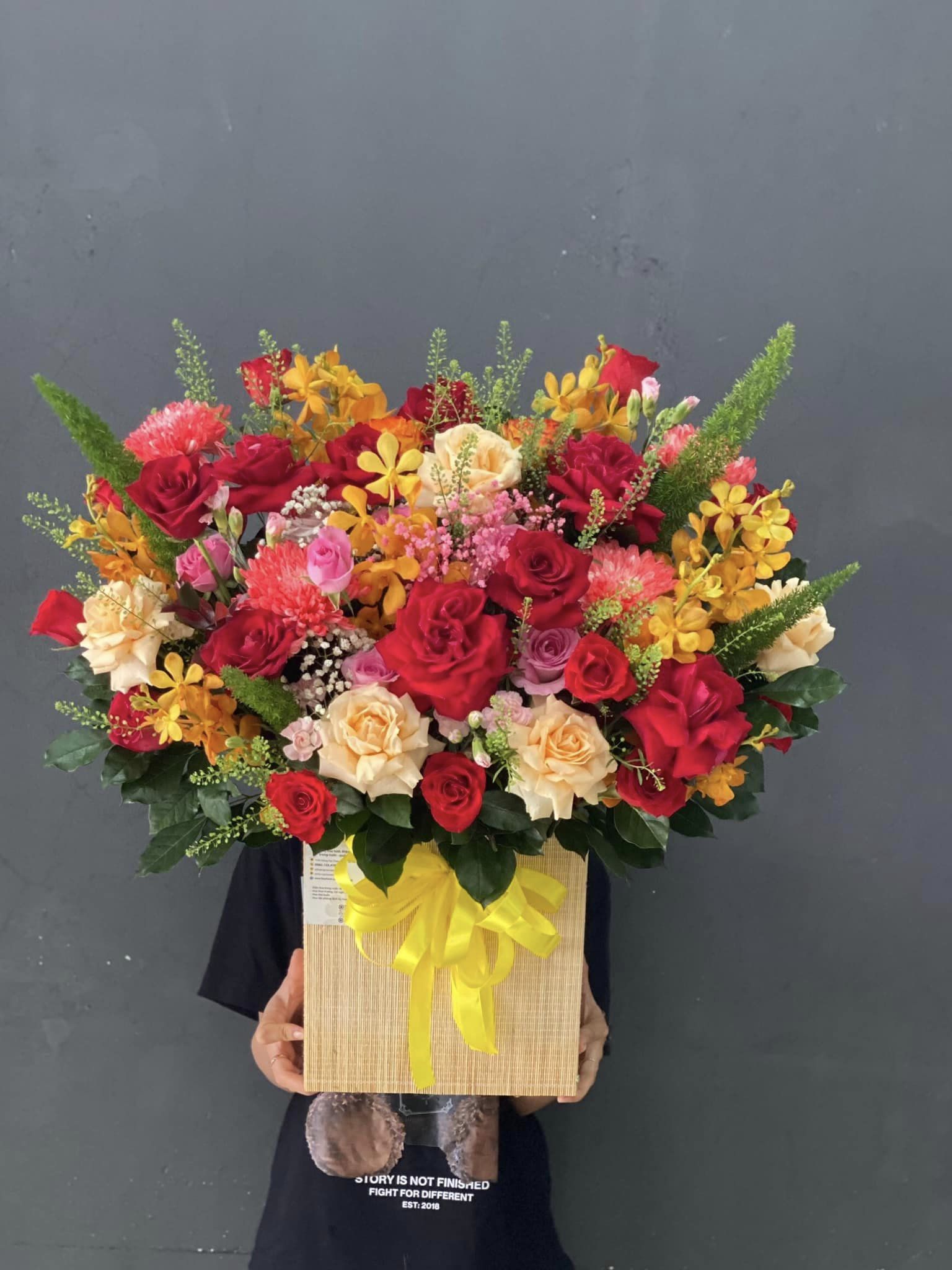 Hoa hồng đỏ, hoa hồng victor vàng mix với nhau và thêm hoa lá phụ, cắm theo phong cách hiện đại tạo GIỎ HOA HỒNG MIX THEO PHONG CÁCH HIỆN ĐẠI - HG003 thật rực rỡ nhưng cũng không kém phần sang chảnh.