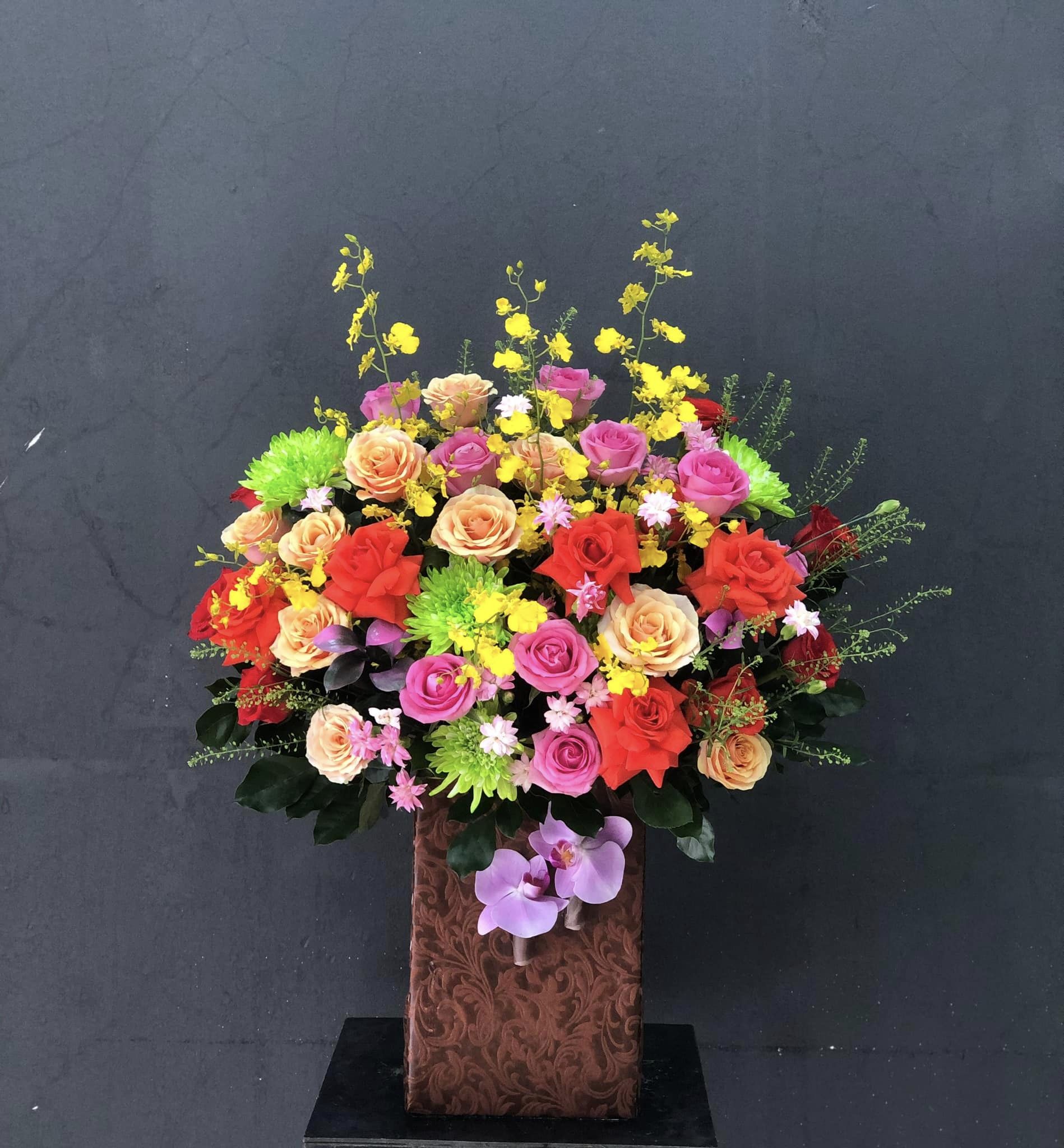 Hoa hồng đỏ, hồng, dâu đất mix với nhau kết hợp với hoa cúc, vũ nữ, lan hồ điệp và thêm hoa lá phụ, cắm theo phong cách hiện đại tạo nên GIỎ HOA HỒNG MIX THEO PHONG CÁCH HIỆN ĐẠI - HG004 thật rực rỡ nhưng cũng không kém phần sang trọng.