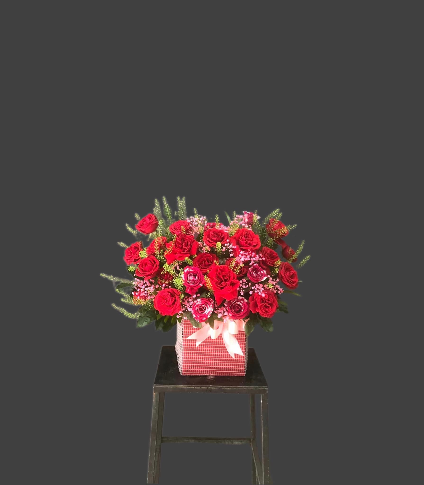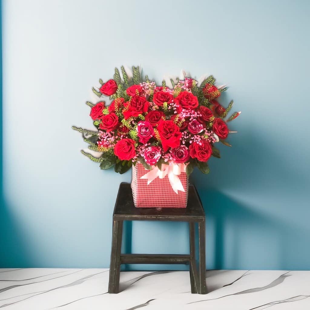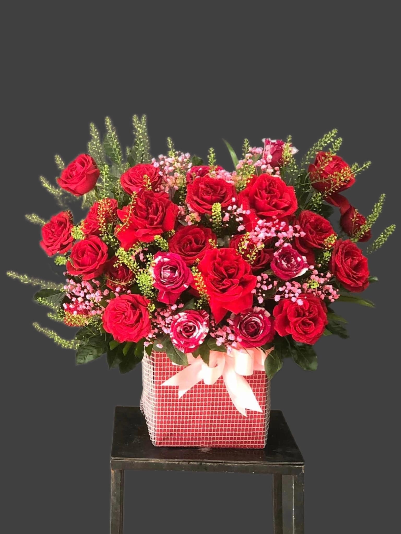Hoa hồng đỏ mix với hồng đỏ kẹo kết hợp với hoa lá phụ, cắm theo phong cách hiện đại tạo nên GIỎ HOA HỒNG ĐỎ MIX THEO PHONG CÁCH HIỆN ĐẠI - HG007 thật rực rỡ nhưng cũng không kém phần sang trọng.