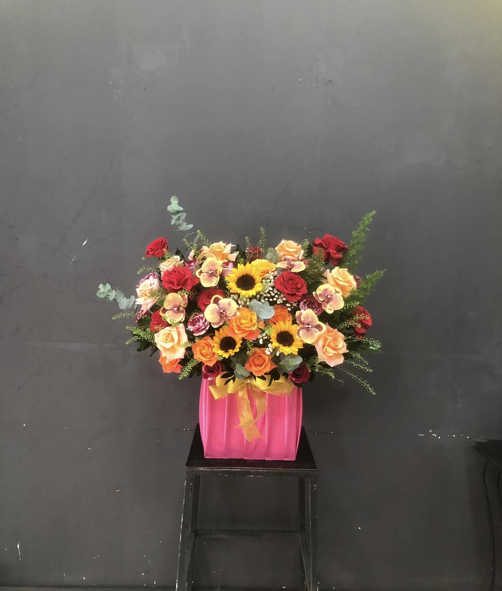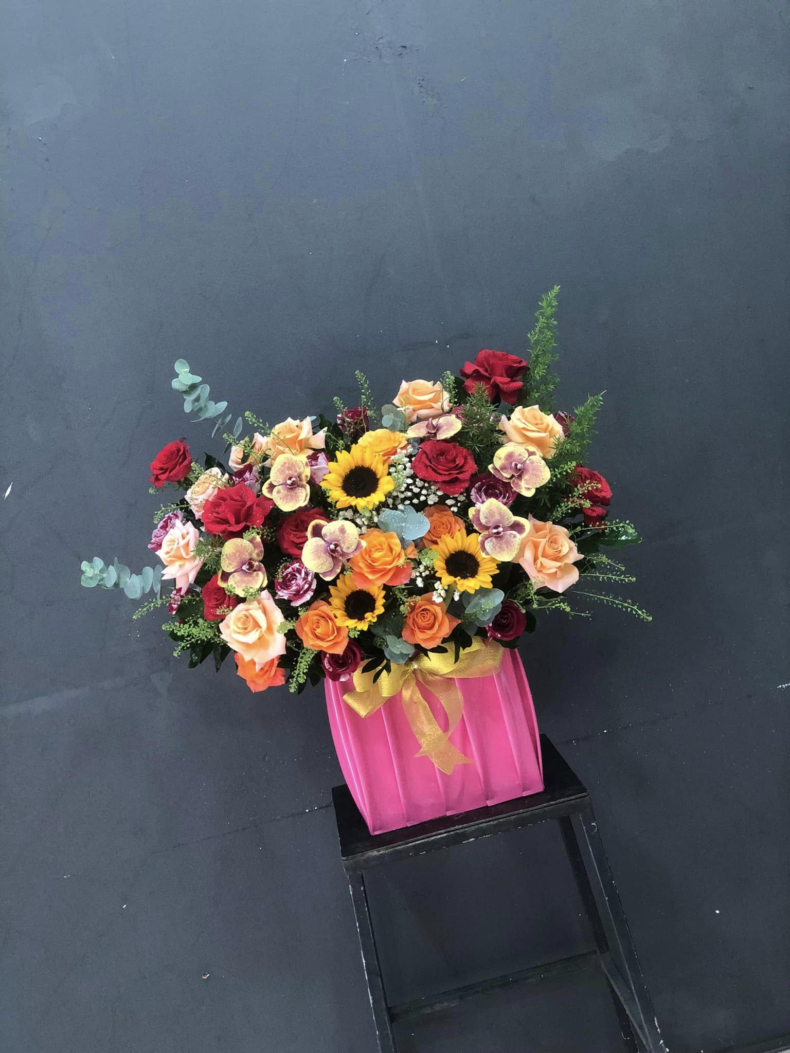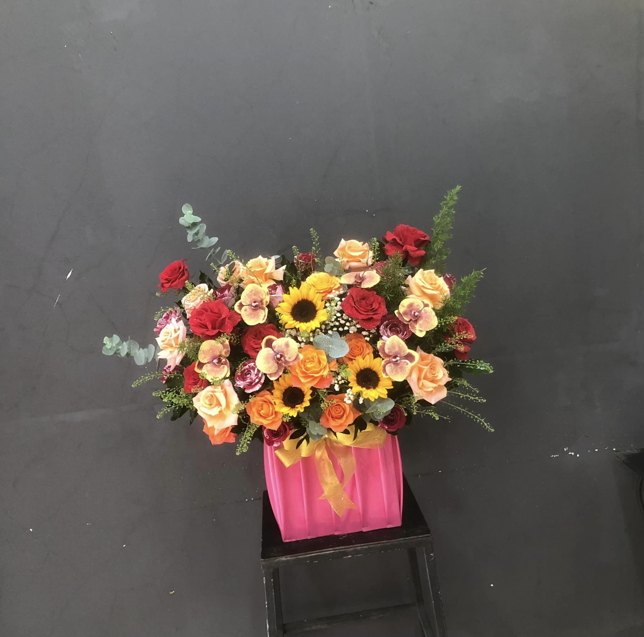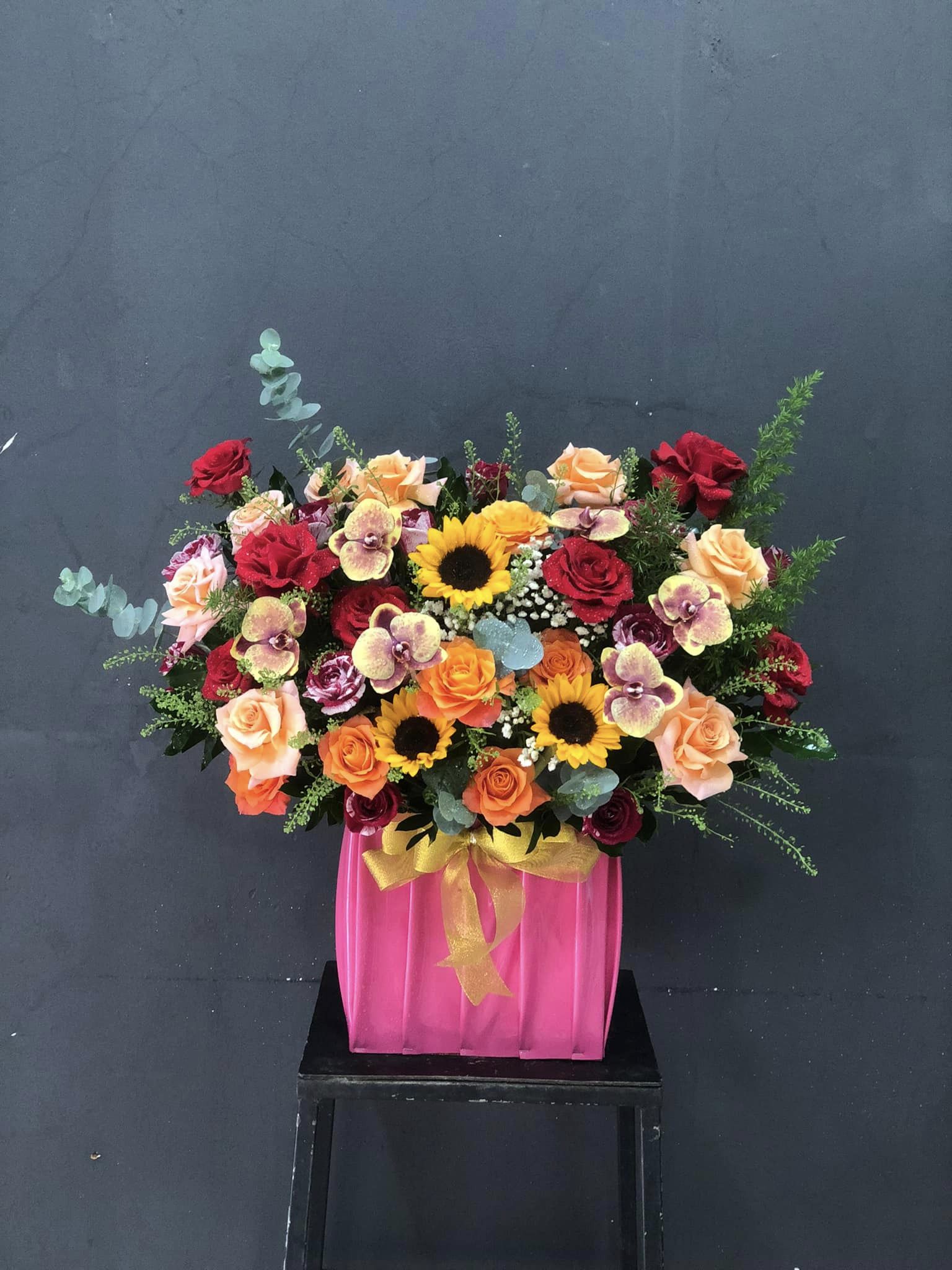 Hoa hồng đỏ, shimmer, hồng cam mix với hoa hướng dương, lan hồ điệp kết hợp với hoa lá phụ, cắm theo phong cách hiện đại tạo nên GIỎ HOA MIX MÀU THEO PHONG CÁCH HIỆN ĐẠI - HG011 thật rực rỡ nhưng cũng không kém phần sang trọng.