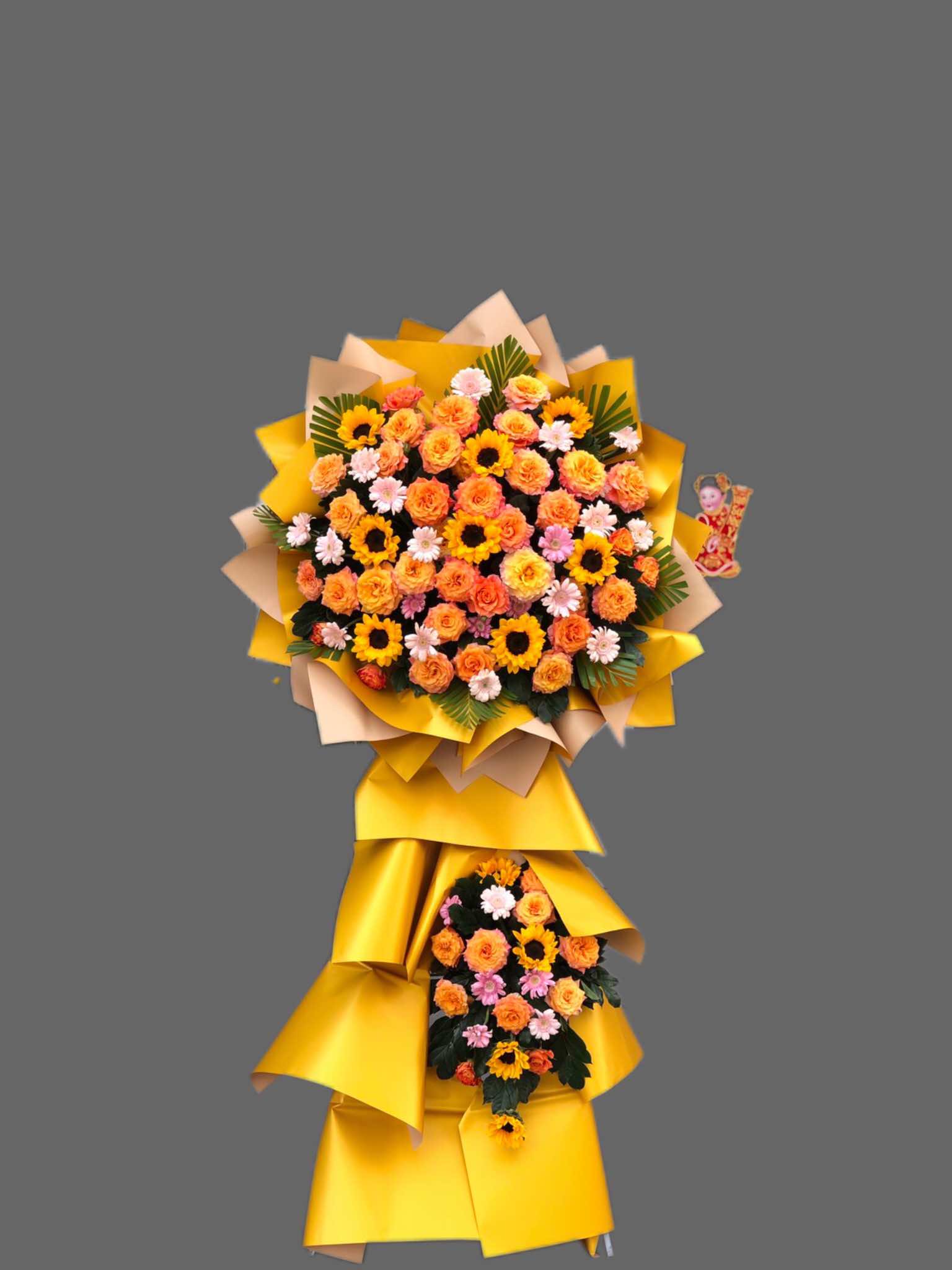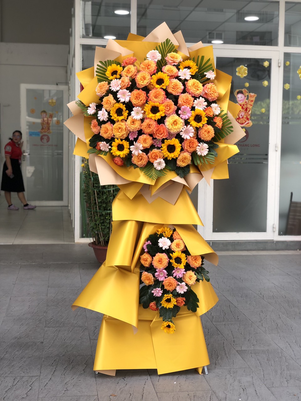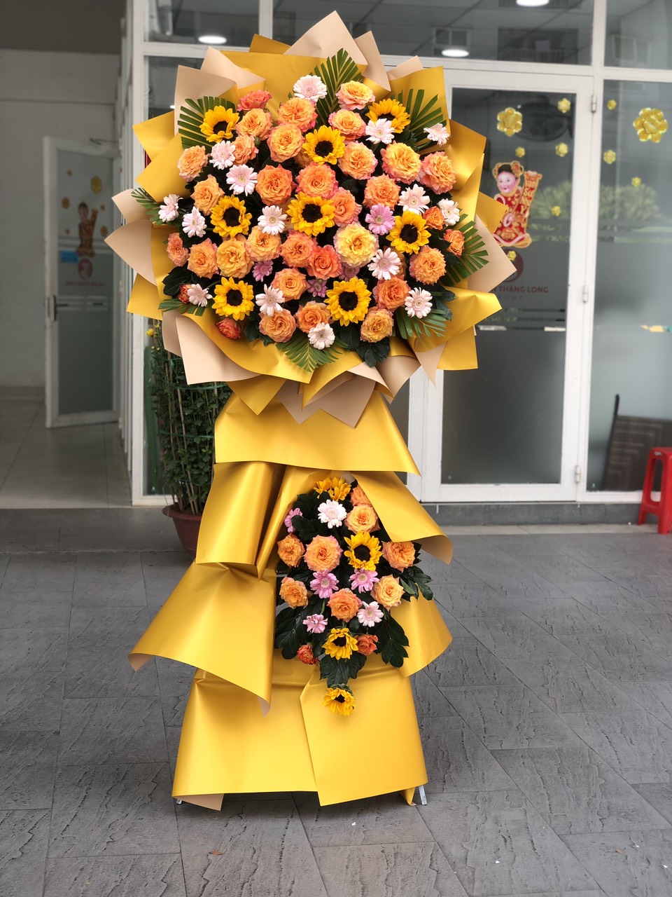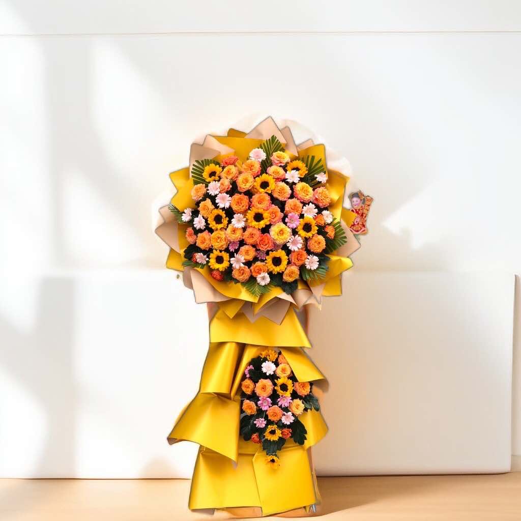 Kệ hoa chúc mừng khai trương KỆ HOA CHÚC MỪNG KHAI TRƯƠNG-KCM001 được thiết kế từ hoa hồng, hoa hướng dương và hoa lá phụ - là một món quà độc đáo và ý nghĩa để tặng cho người thân, bạn bè nhân dịp chúc mừng, Khai trương.