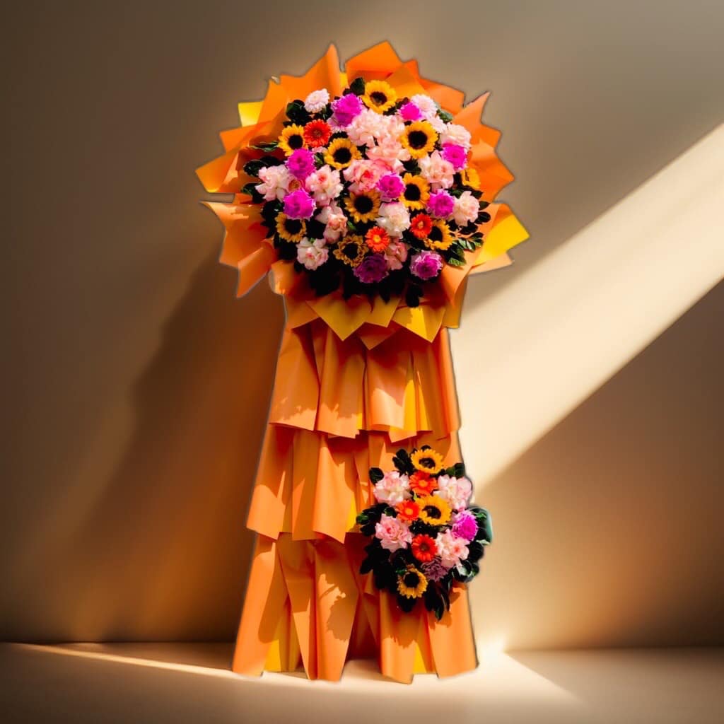 KỆ HOA CHÚC MỪNG KHAI TRƯƠNG MIX MÀU - KCM005 được thiết kế từ hoa hồng, hoa hướng dương, hoa đồng tiền, kết hợp với hoa lá phụ - là một món quà độc đáo và ý nghĩa để tặng cho người thân, bạn bè nhân dịp chúc mừng, Khai trương.