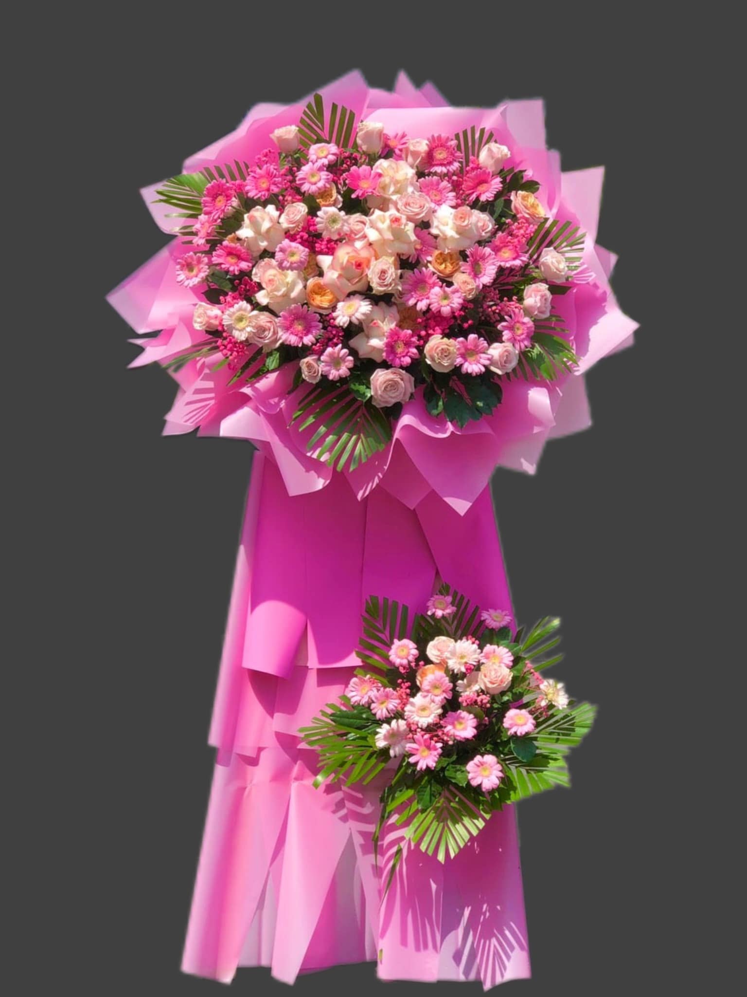 KỆ HOA CHÚC MỪNG KHAI TRƯƠNG TONE HỒNG - KCM006 có thể thay đổi màu hoa, loại hoa, màu giấy cho phù hợp với Chủ đề của buổi lễ Khai trương.