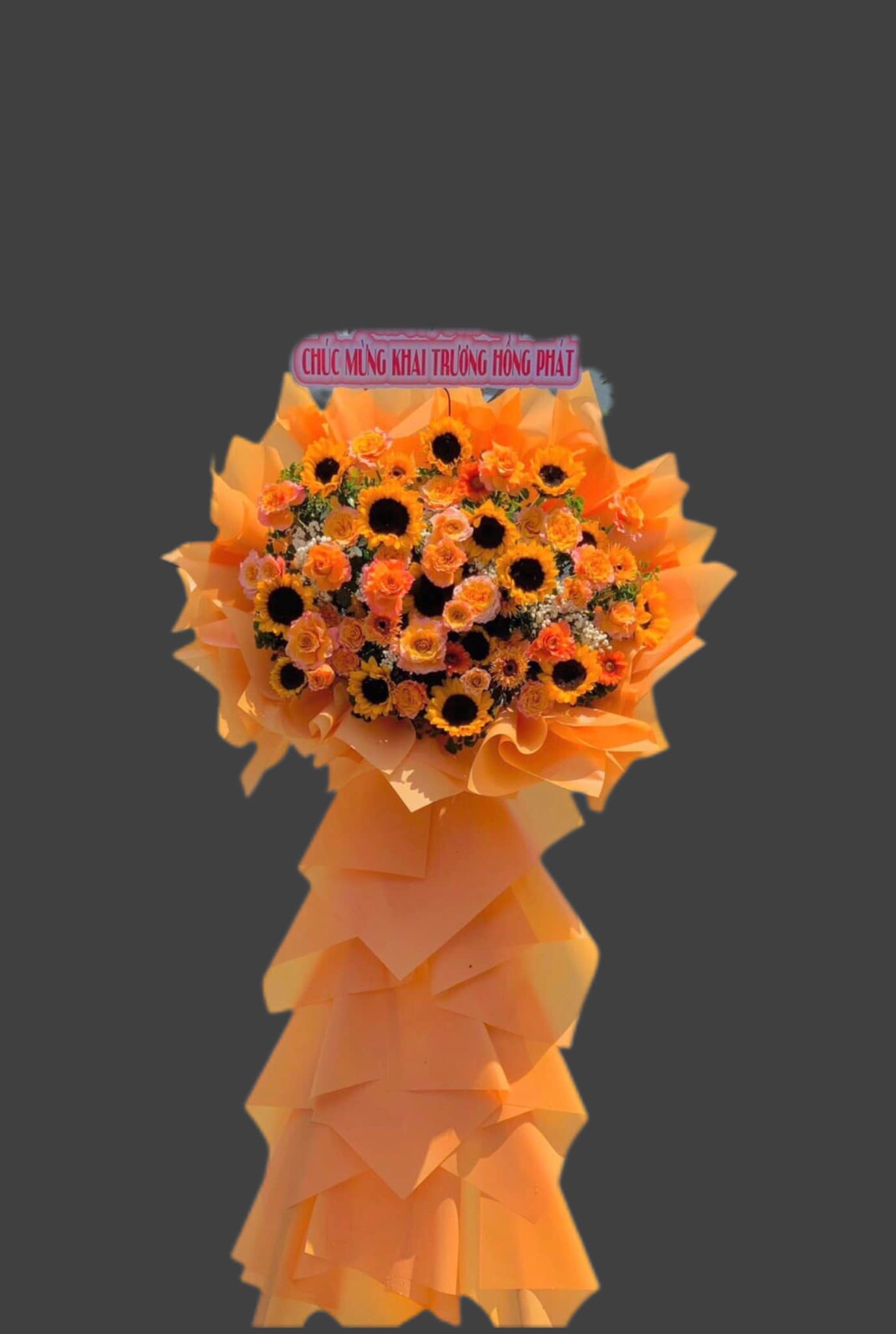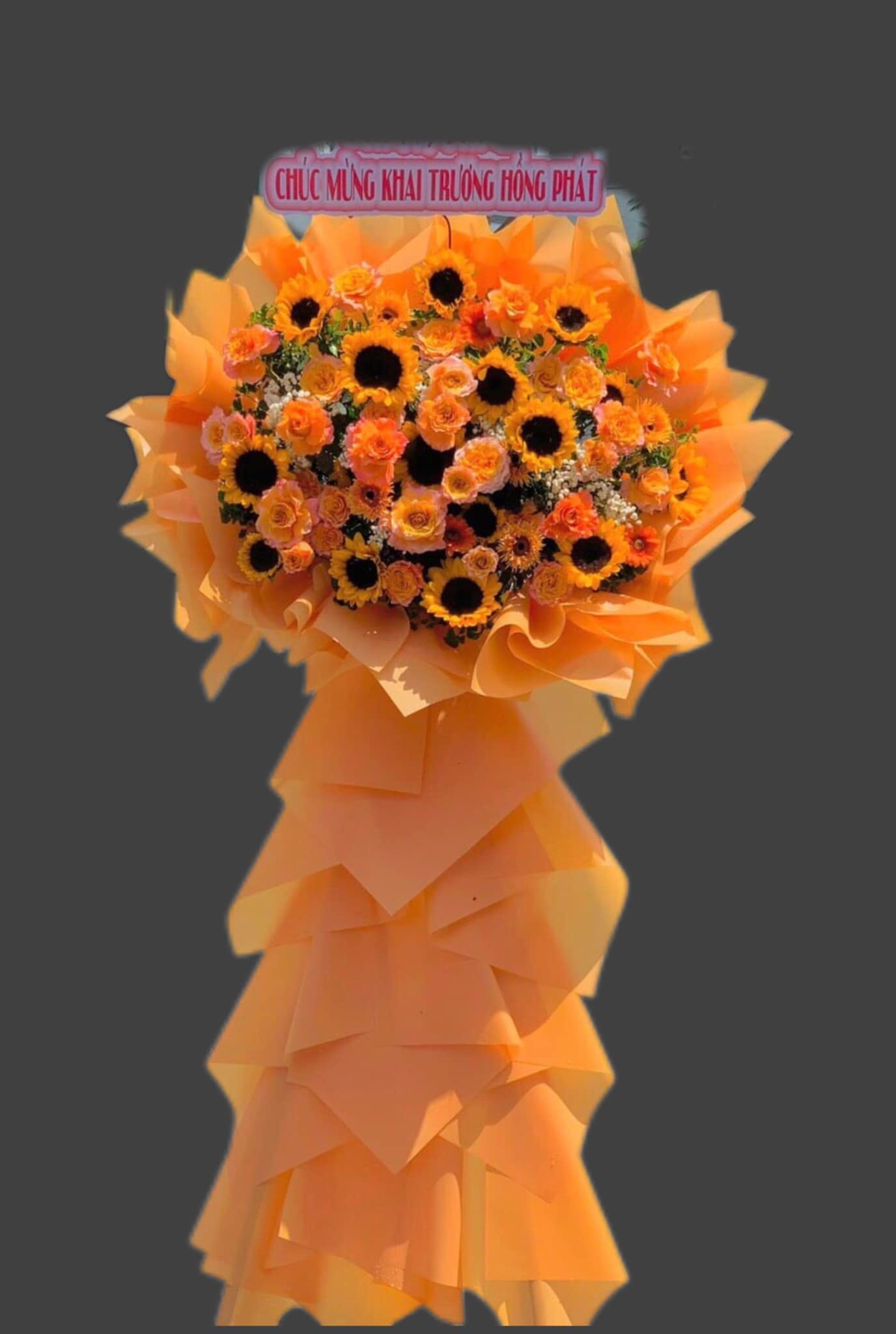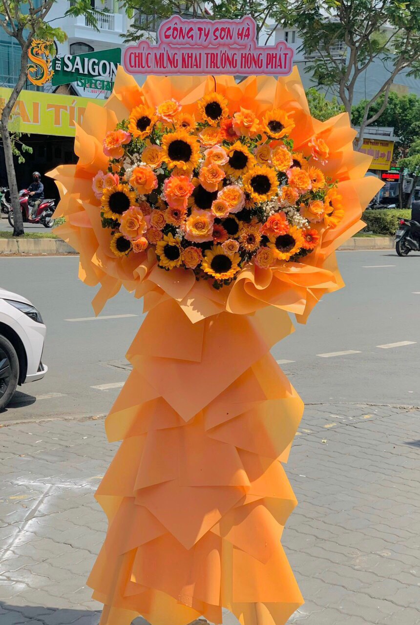 KỆ HOA CHÚC MỪNG KHAI TRƯƠNG TONE VÀNG CAM - KCM004 được thiết kế từ hoa hồng, hoa hướng dương, kết hợp với hoa lá phụ - là một món quà độc đáo và ý nghĩa để tặng cho người thân, bạn bè nhân dịp chúc mừng, Khai trương.