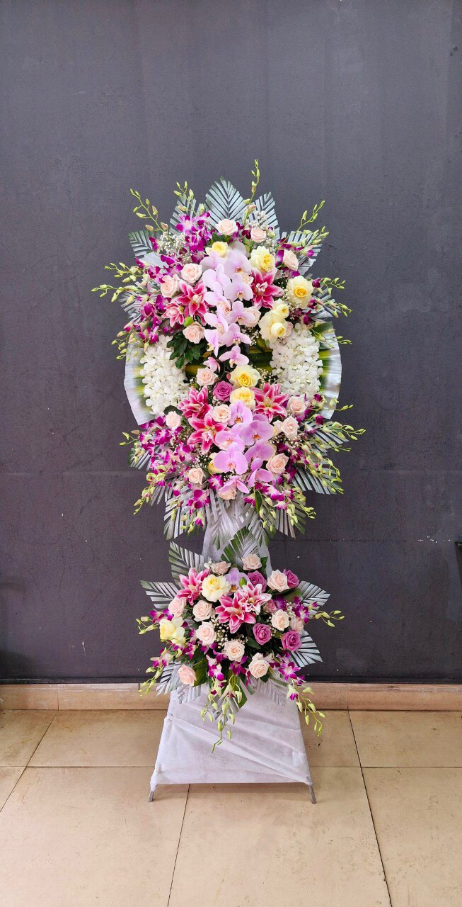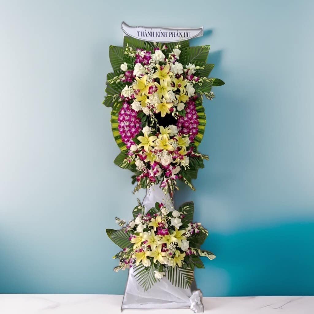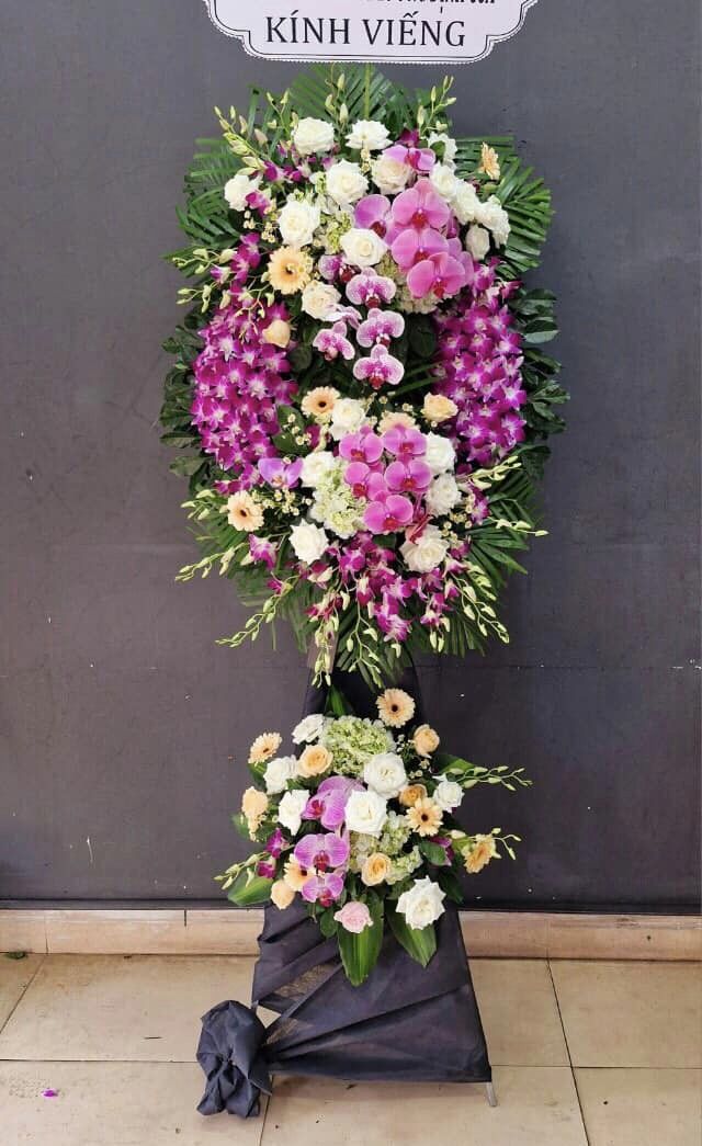 KỆ HOA VIẾNG 3 TẦNG MIX MÀU - HV006 được cắm theo phong cách cổ điển, được kết hợp từ Hoa Lan Thái, Lan hồ điệp, hoa hồng, hoa ly thêm hoa lá phụ, cắm theo phong cách cổ điển tạo nên KỆ HOA VIẾNG 3 TẦNG MIX MÀU - HV006 thật sang trọng.