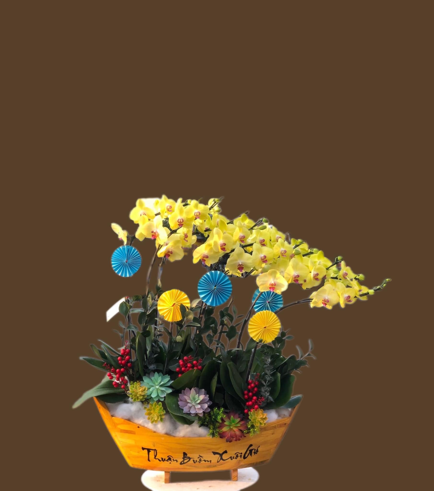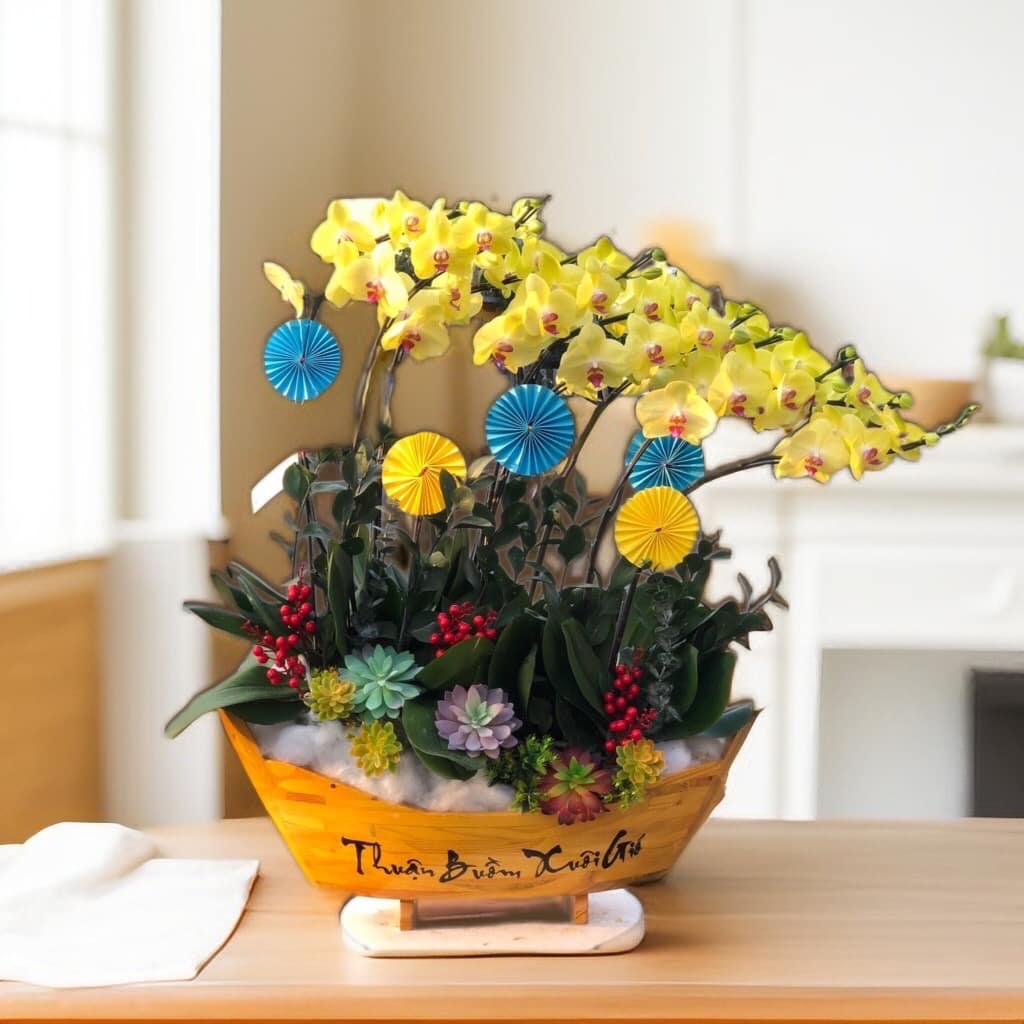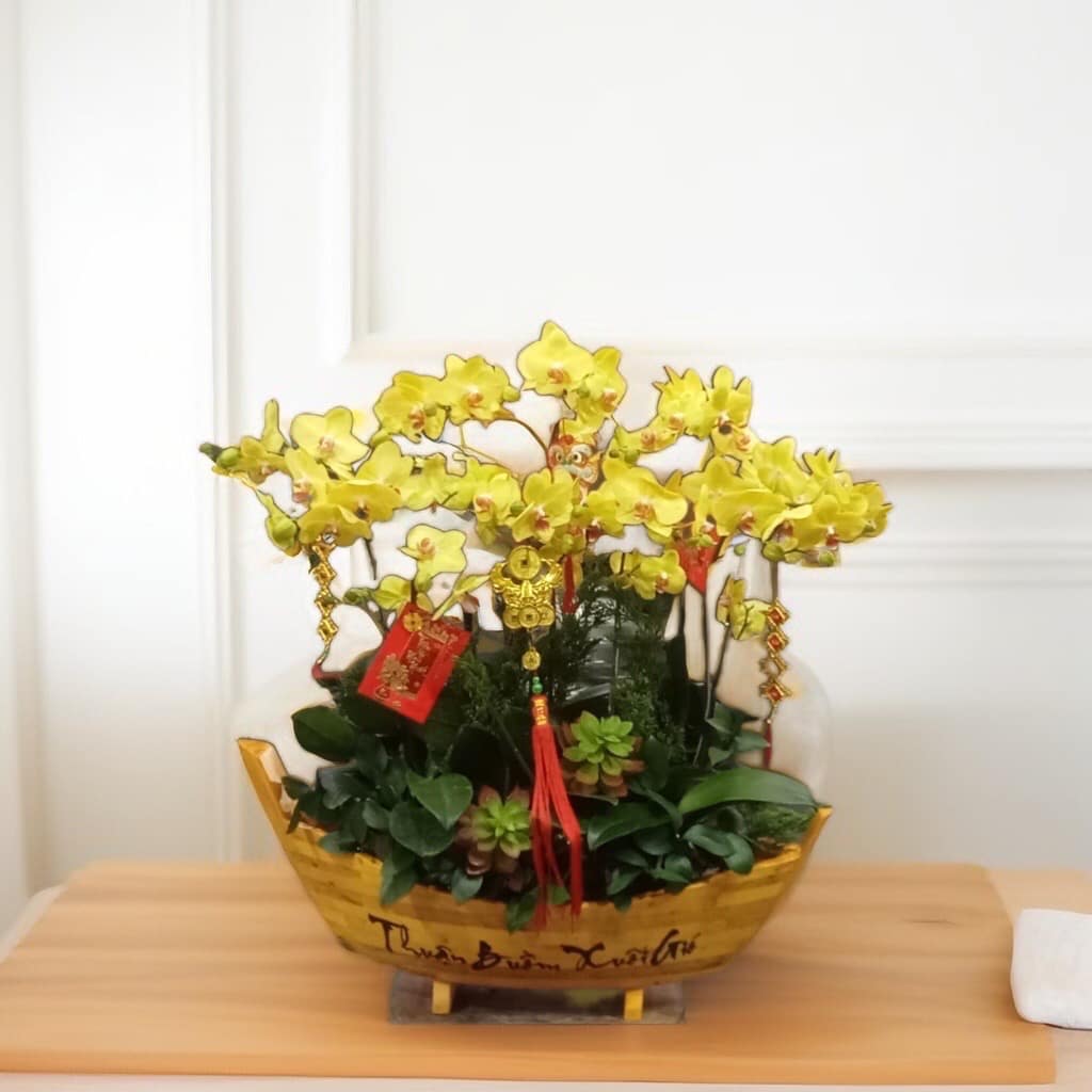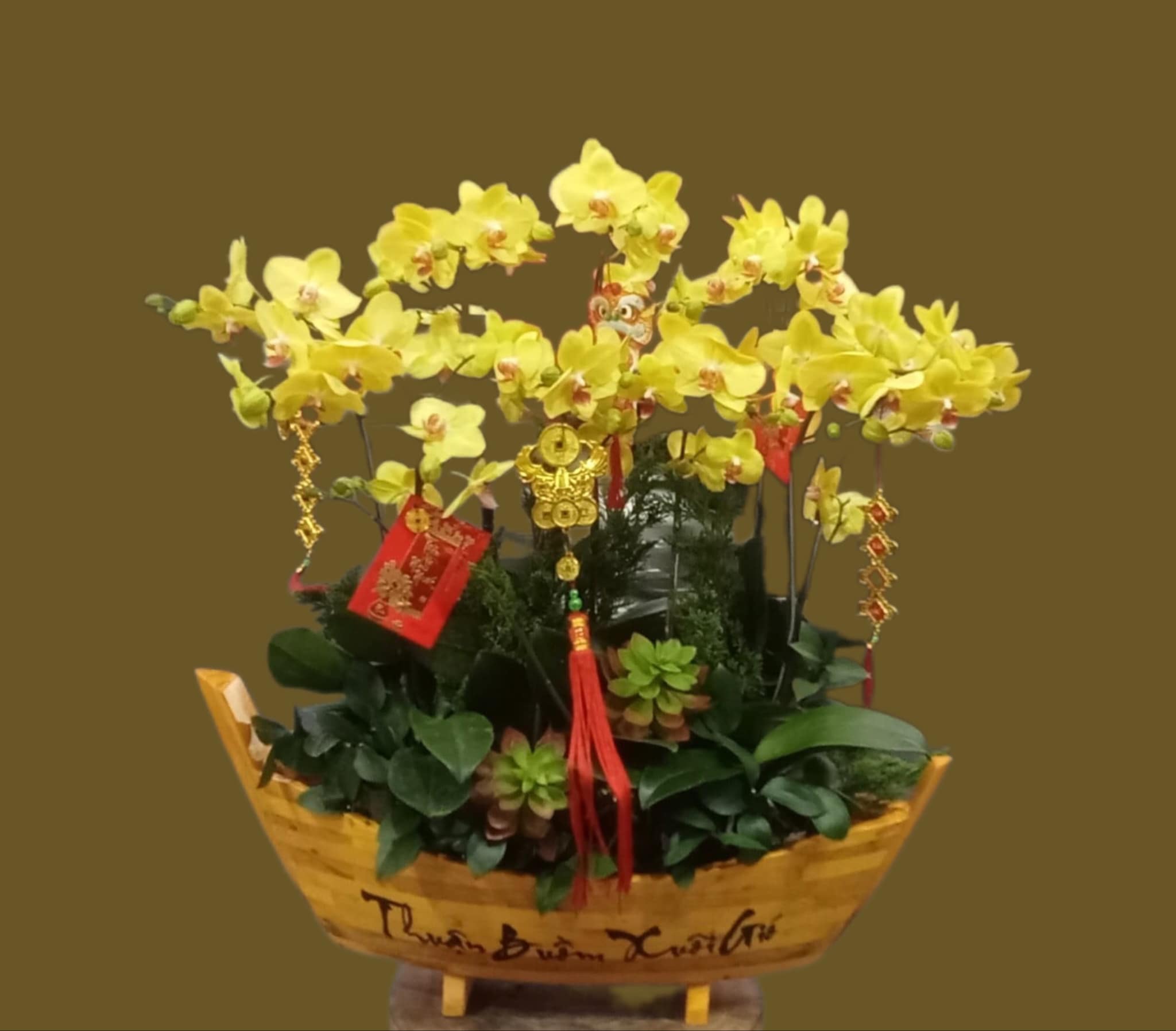 10 cây Lan hồ điệp vàng được trồng trong chậu thuyền THUẬN BUỒM XUÔI GIÓ điểm thêm sen đá hoặc hoa lá phụ tạo nên CHẬU LAN HỒ ĐIỆP THUẬN BUỒM XUÔI GIÓ - LHD001 thật sang trọng.